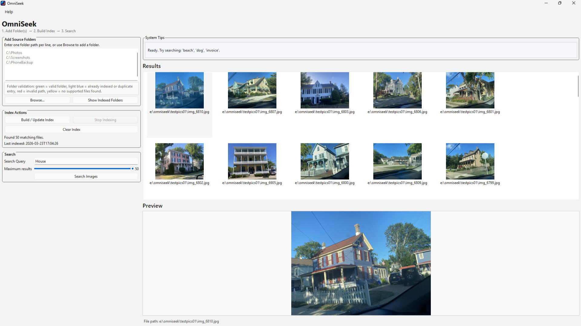 OmniSeek scans your local files — nothing is uploaded or shared.⚙️ Step 2 — Build your index (one-setup)Click “Build Index” and OmniSeek analyzes your images using local AI.